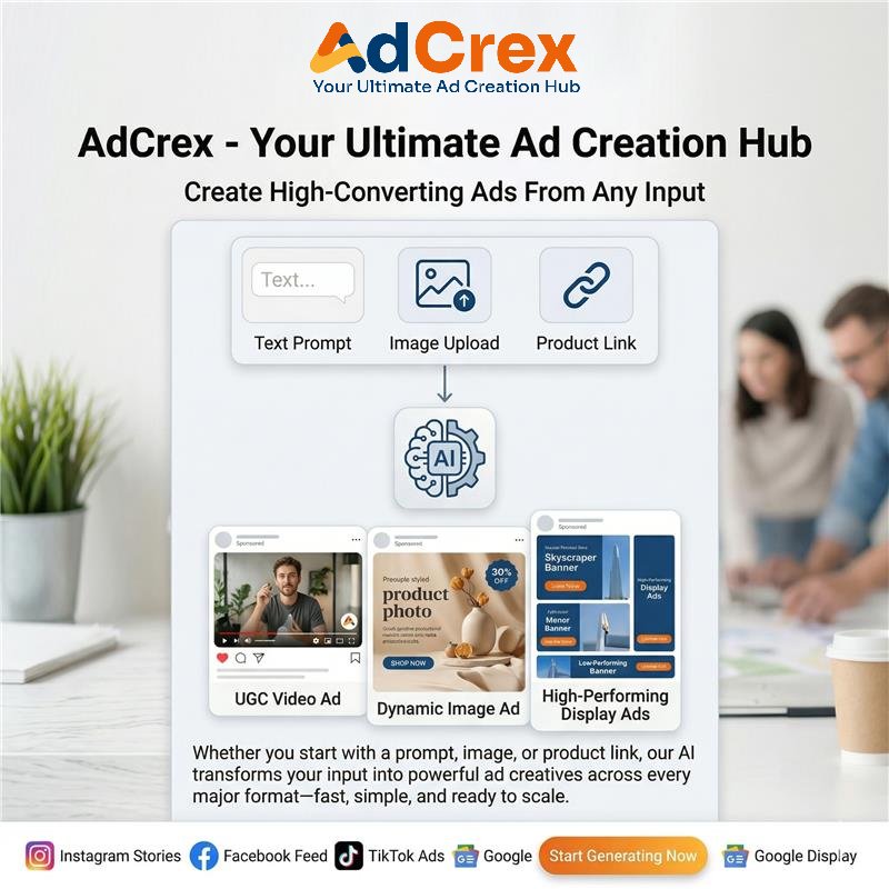 AdCrex uses advanced AI trained on thousands of high-converting ads. When you enter your product and brand details, the AI analyzes best practices for your industry and generates multiple ad variations optimized for engagement and conversions. Each ad includes professional headlines, visuals, and CTAs tailored to your brand and audience.